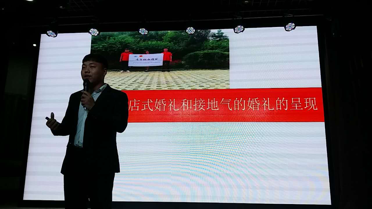 今年我系共有7支团队25人参加“青年服务国家”暑期社会实践活动,奔赴北京、内蒙古、辽宁、山东、安徽等地。实践内容涉及专业调研、文化宣讲、志愿服务、教育帮扶、新农村文化建设等方面,同学们利用暑假深进社会、了解国情、体验社情。在汇报会现场,各团队同学们通过PPT、音频、视频等形式声图并茂地向同学们畅谈自己的感受和心得体会。各小组依次汇报完毕后,张政资团队的“一张家庭照,传递社管情”主题活动获得一等奖;王宁团队“山西长治地区新农村婚俗调研”和“青城山下的朗朗读书声”获得二等奖。闫智维团队“弘扬蒙古族优秀旅游文化”、苑彤彤团队“山东德州婚庆市场调研”、钱政昌团队“婚礼人的梦”、宋宏伟团队“管管爱心志愿团”获得三等奖。