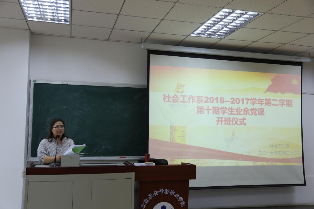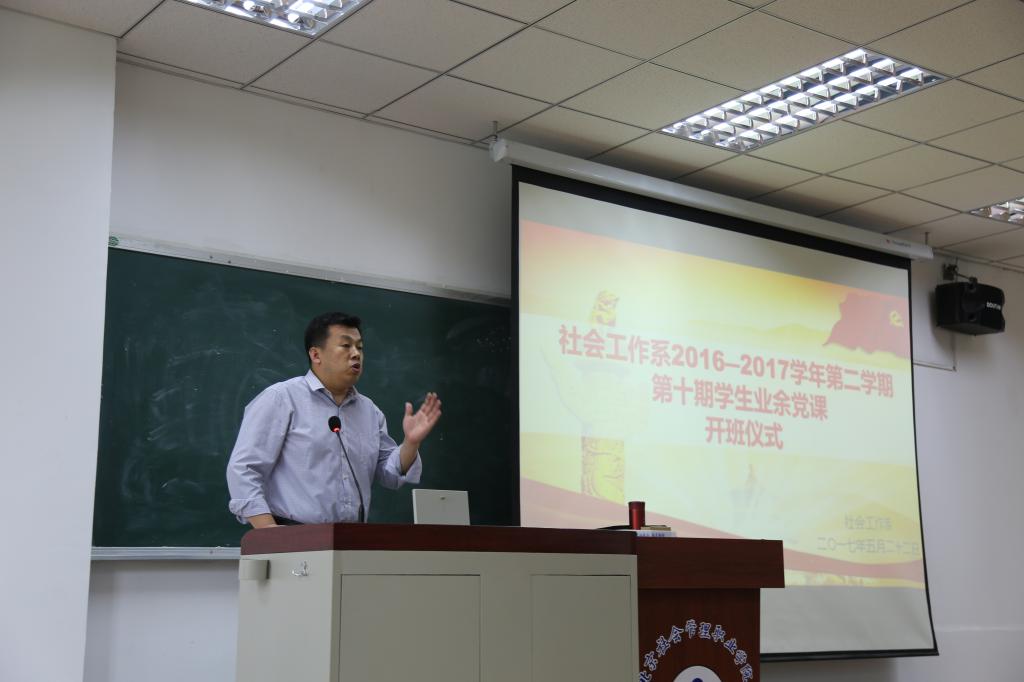 5月22日中午,社会工作系第十期学生业余党课开班仪式于康复楼104成功举办,党课第一讲由党支部书记赵学慧同志主讲。副书记何振锋、组织委员孔春杰、纪检委员黄晓强、党员老师叶新强、许丹丹以及80名同学参加了开班仪式。活动由党支部宣传委员乐娜主持。