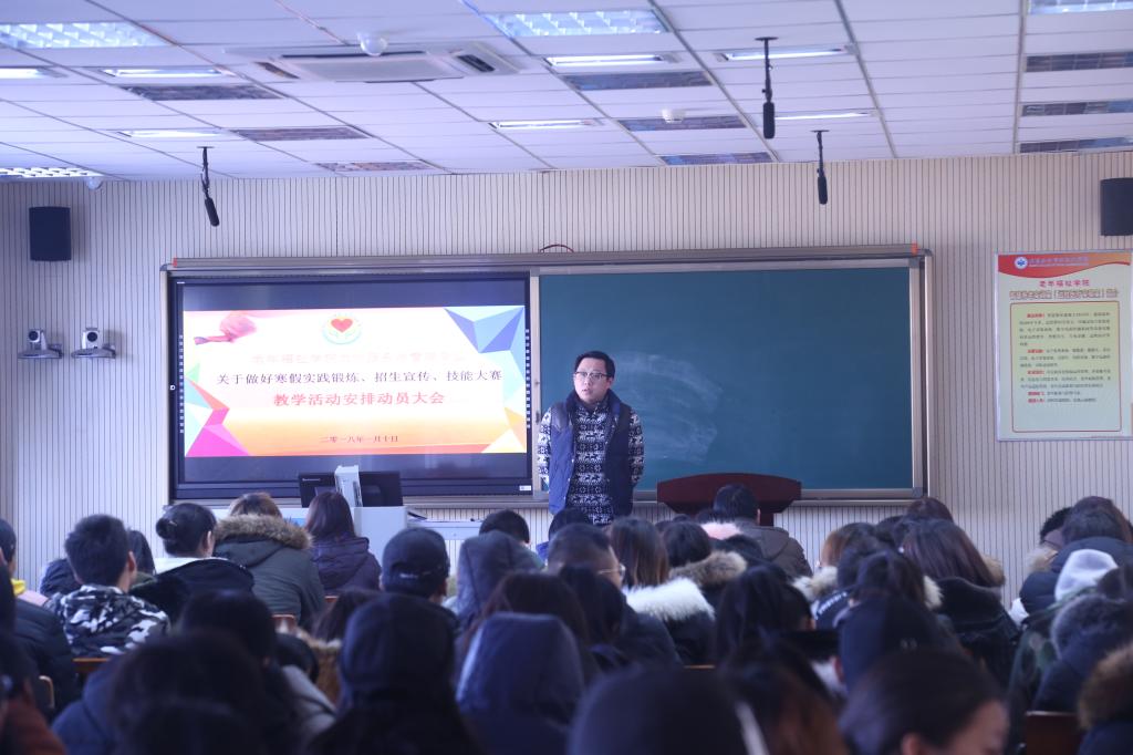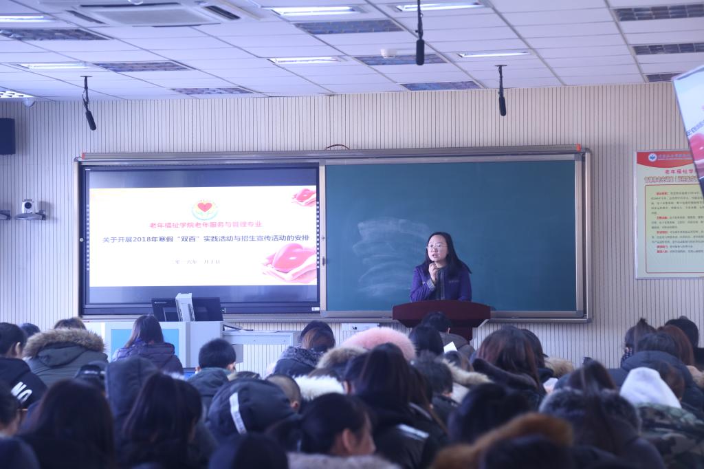 1月10日上午,老年福祉学院老年服务与管理专业召开2018年养老护理技能竞赛、寒假“双百”实践活动、专业招生宣传活动动员会,老年福祉学院院长杨根来、招生与就业服务中心主任任飞、老年福祉学院副院长王伟等老师出席会议。老年服务与管理专业2016级、2017级近140名学生参加了动员会。